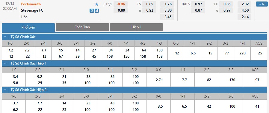 Tỷ lệ kèo cá cược bóng đá trực tuyến trận Portsmouth vs Stevenage