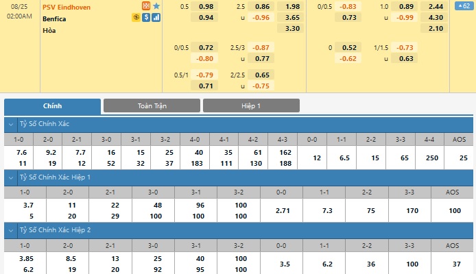 Xem tỉ lệ kèo cá cược bóng đá trực tuyến PSV Eindhoven vs Benfica