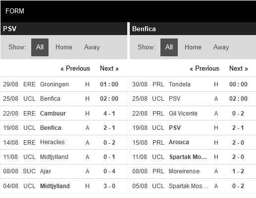 4 lần đối đầu gần nhất của 2 đội đang có thành tích nghiêng về Benfica với 2 chiến thắng, 1 trận hòa và 1 trận thua. Benfica có thành tích không tốt khi đến làm khách của PSV khi chưa thắng tại Philips lần nào. Tuy vậy, với việc chỉ cần phải cầm hòa, Benfica cũng không cần thiết phải giành chiến thắng. Với phong độ tốt và một hàng thủ chất lượng, Benfica đủ khả năng đạt được mục tiêu này.