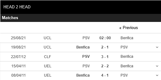Thống kê đối đầu PSV Eindhoven vs Benfica