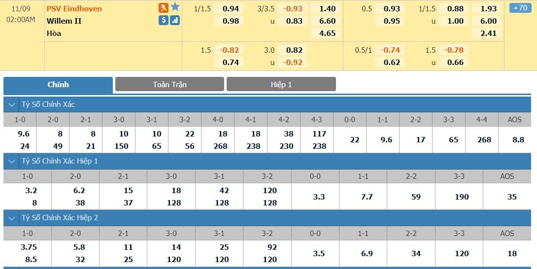 Tỷ lệ kèo cá cược bóng đá trận PSV Eindhoven vs Willem II Tilburg