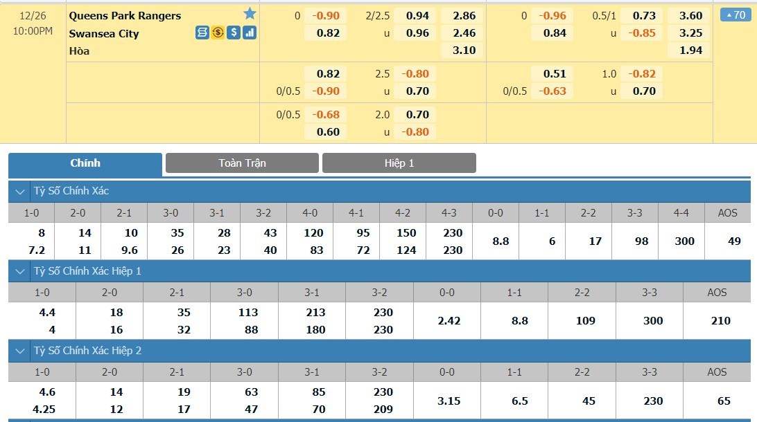 Tỷ lệ kèo cá cược bóng đá trực tuyến trận Queens Park Rangers vs Swansea