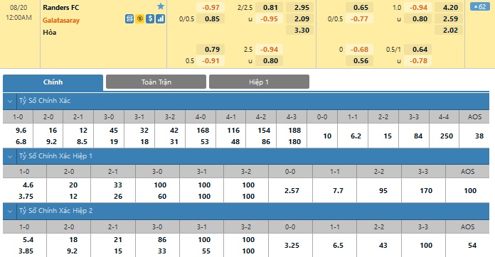 Galatasaray là đội cửa trên nhưng đá hiệp 1 không quá tốt. Trong 5 trận gần nhất, họ thua 2, hòa 2 và chỉ thắng hiệp 1 đúng 1 trận. Trái lại, Randers thắng 4/5 trận gần nhất trong hiệp đấu đầu tiên. Do đó, nhiều khả năng đội chủ nhà sẽ có được một kết quả tích cực trong 45 phút đầu.