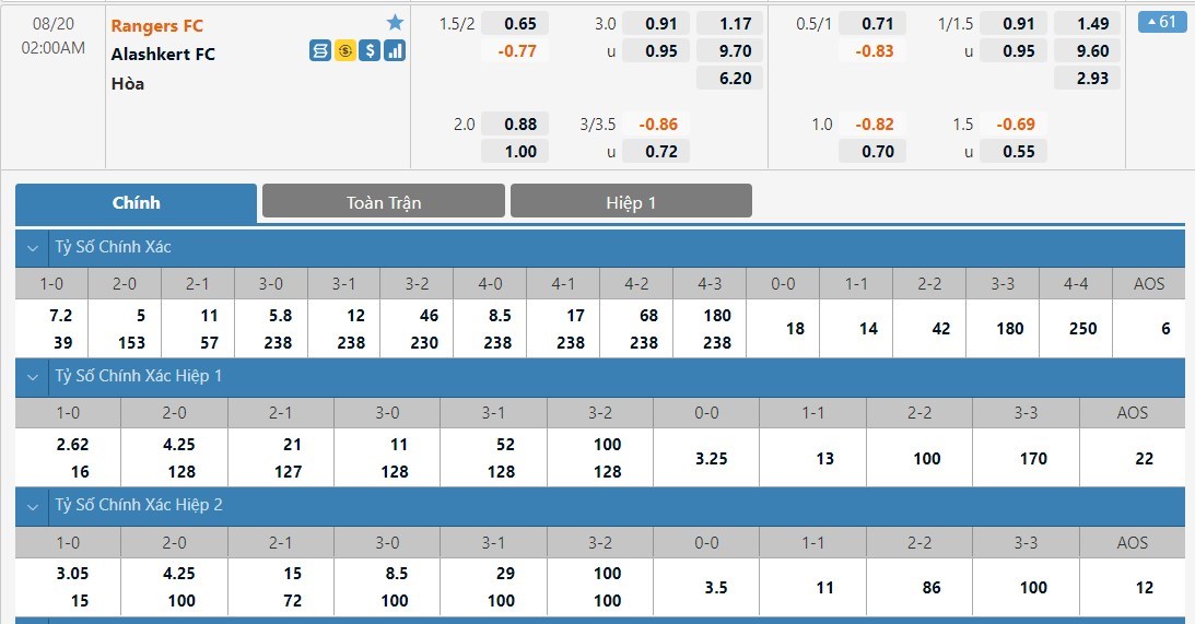 Tỷ lệ kèo cá cược bóng đá trận Rangers vs Alashkert FC