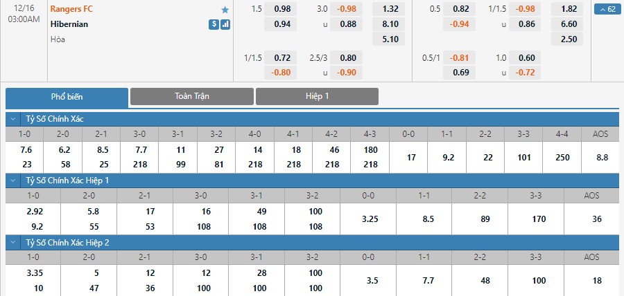 Xem tỷ lệ kèo cá cược bóng đá trực tuyến Rangers vs Hibernian