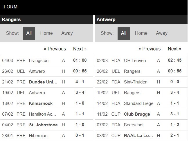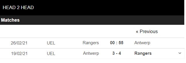 Thống kê đối đầu Rangers vs Royal Antwerp