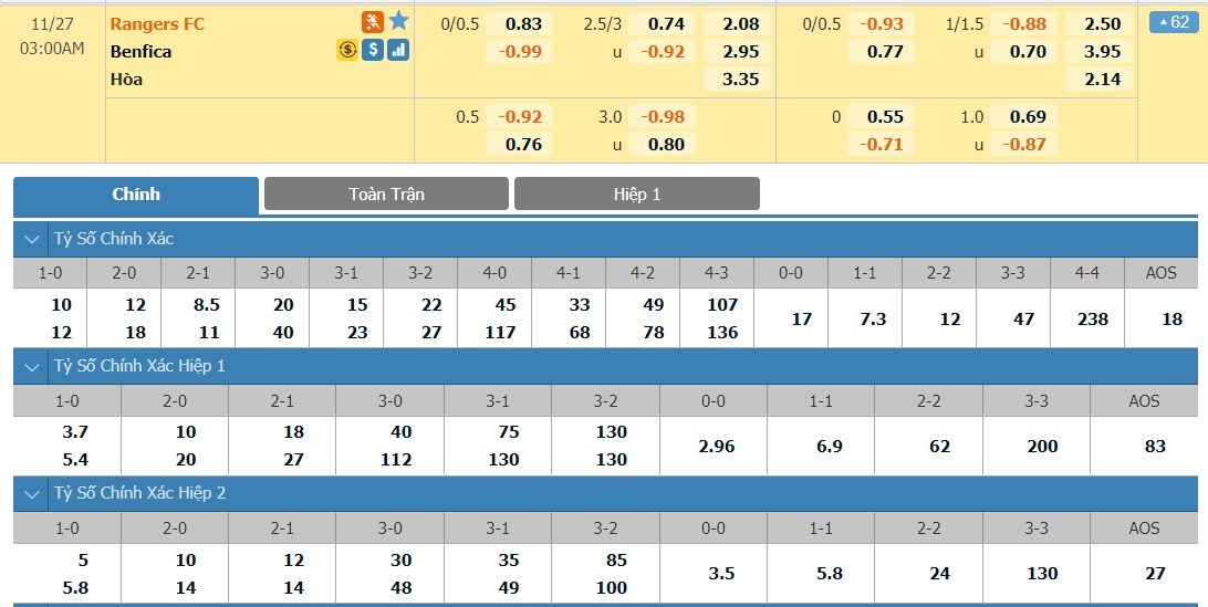 Tỷ lệ kèo cá cược bóng đá trận Rangers vs SL Benfica
