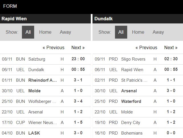 Trong khuôn khổ lượt trận thứ 3 bảng B UEFA Europa League năm nay sẽ là màn chạm trán giữa Rapid Vienna và đối thủ Dundalk. Rapid Vienna cho thấy 2 bộ mặt khác nhau ở các đấu trường riêng biệt. Ở giải đấu quốc nội, đội bóng thủ đô nước Áo có 16 điểm và vị trí nhì bảng tại giải VĐQG và cũng đi sâu ở Cup Quốc gia. Tuy nhiên, tại Europa League, họ toàn thua và tạm đứng hạng 3 bảng đấu sau 2 lượt trận. Thực tế thì ở bảng đấu này, Arsenal và Molde là những đội bóng được đánh giá cao hơn hẳn và rất khó để Rapid Wien nghĩ tới việc cạnh tranh tấm vé đi tiếp.
