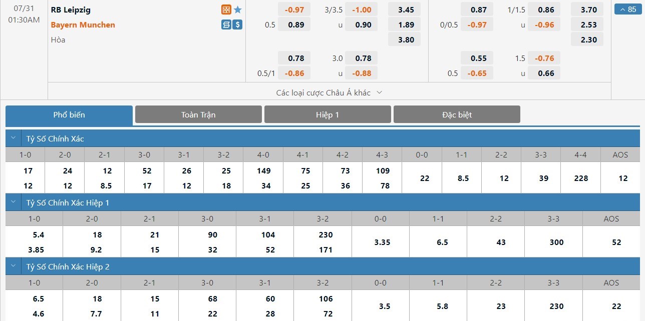 Xem tỷ lệ kèo cá cược bóng đá trực tuyến RB Leipzig vs Bayern Munich