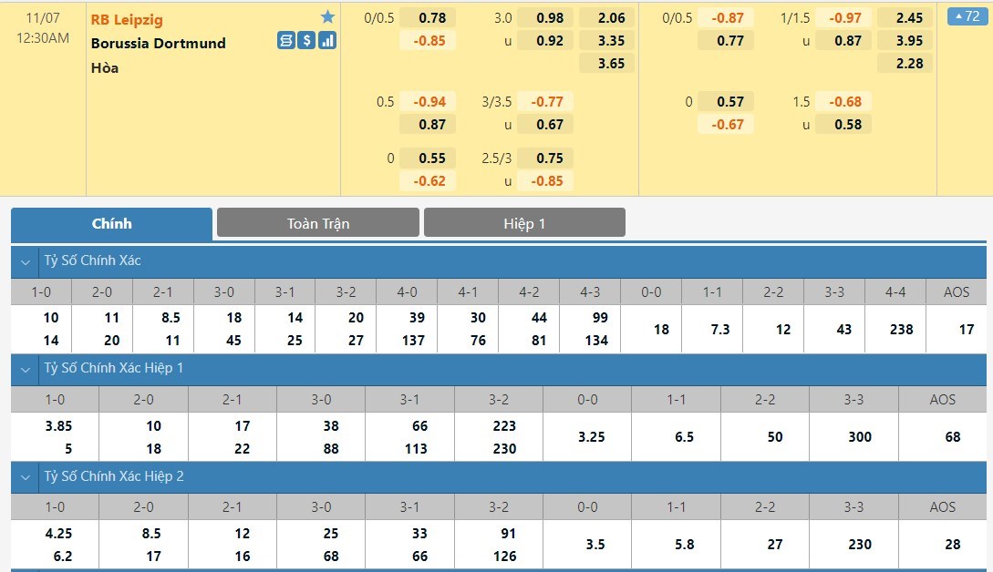 Tỷ lệ kèo cá cược bóng đá trực tuyến trận RB Leipzig vs Borussia Dortmund