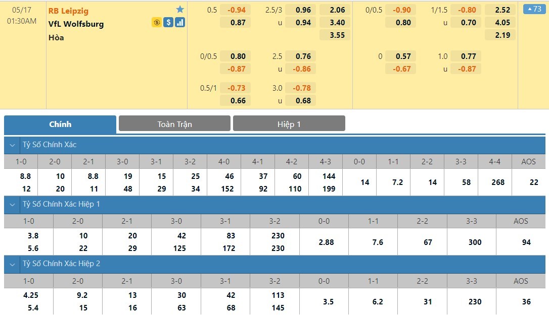 Tỷ lệ kèo cá cược bóng đá trực tuyến trận RB Leipzig vs Wolfsburg