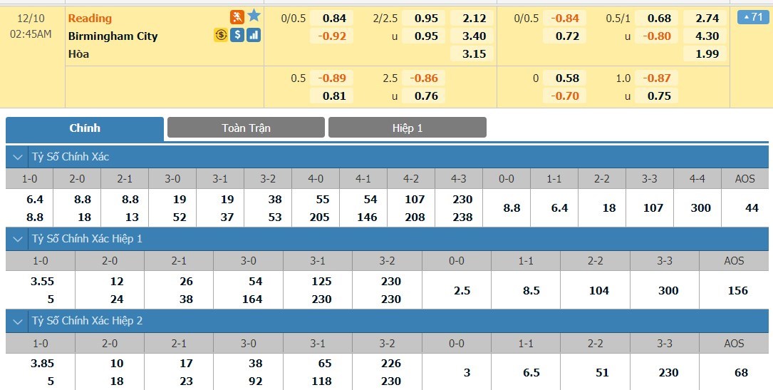 Các trận đấu có sự góp mặt của Reading mùa này có trung bình tới 2,8 bàn. 90 phút tới với sự hưng phấn của đôi bên có thể là 1 cuộc rượt đuổi tỷ số. 5 trận đấu gần đây nhất giữa 2 đội có tổng cộng 14 bàn thắng được ghi. Các trận đấu có sự góp mặt của Reading luôn là các cơn mưa bàn thắng khi đội bóng này ghi 26 bàn và cũng lọt lưới 19 lần. 90 phút tới, Birmingham chắc chắn không dễ thua nên có thể tạo ra 1 trận cầu có nhiều bàn thắng.