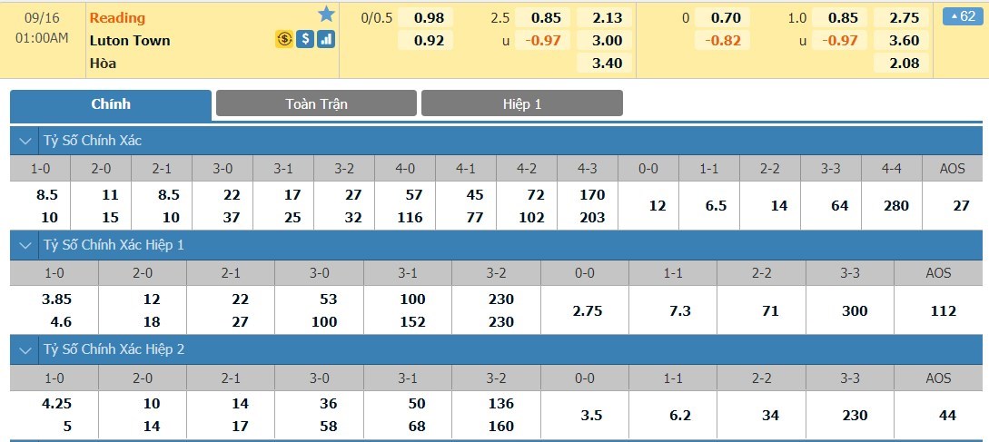 Tỷ lệ kèo cá cược bóng đá trận Reading vs Luton Town