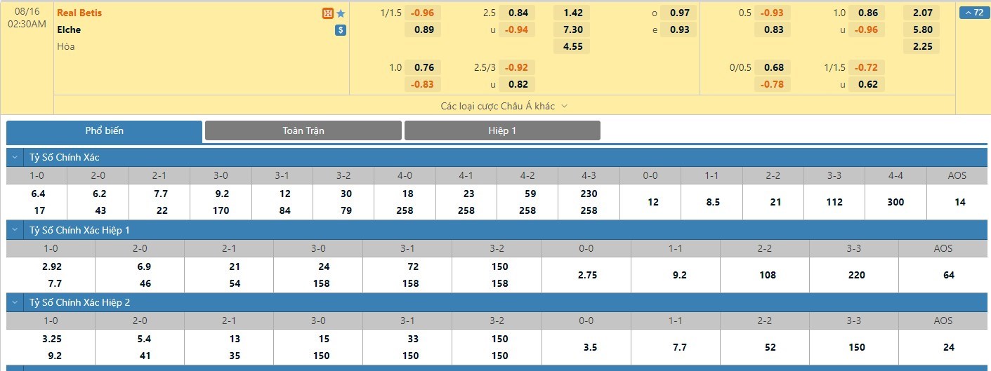 Tỷ lệ kèo cá cược bóng đá trực tuyến trận Real Betis vs Elche