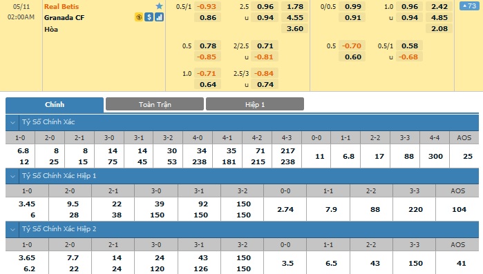 Xem tỉ lệ kèo cá cược bóng đá trực tuyến Real Betis vs Granada