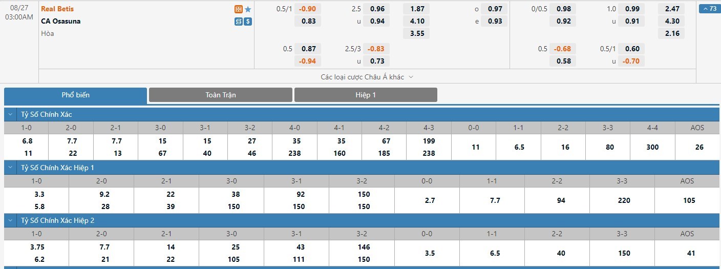Tỷ lệ kèo cá cược bóng đá trực tuyến trận Real Betis vs Osasuna