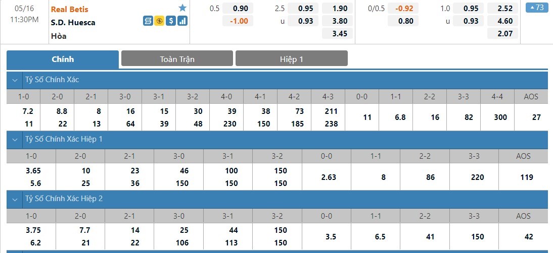 Tỷ lệ kèo cá cược bóng đá trận Real Betis vs SD Huesca