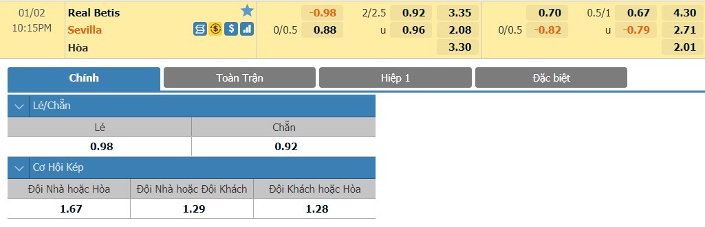 Xem tỷ lệ kèo cá cược bóng đá trực tuyến Real Betis vs Sevilla