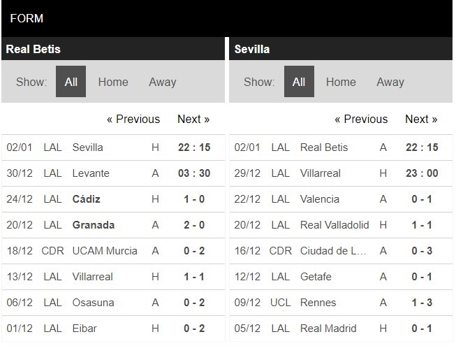 Thống kê phong độ Real Betis vs Sevilla
