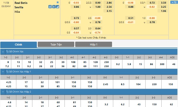 Xem tỉ lệ kèo cá cược bóng đá trực tuyến Real Betis vs Sevilla