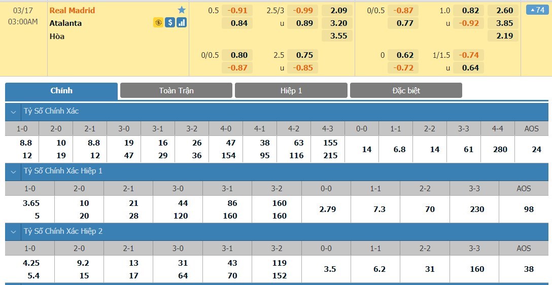 Xem tỷ lệ kèo cá cược bóng đá trực tuyến Real Madrid vs Atalanta