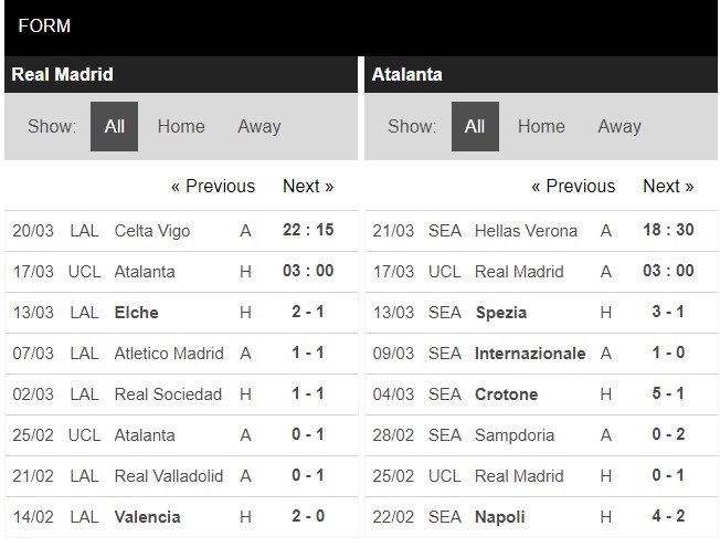 Trận đấu lượt về vòng 1/8 tiếp theo của UEFA Champions League năm nay sẽ là màn chạm trán giữa Real Madrid và đối thủ Atalanta. Real Madrid vừa có trận đấu cực kì nhọc nhằn trước tân binh Elche ở vòng đấu thứ 27 giải VĐQG Tây Ban Nha vừa qua. Real Madrid mùa này thi đấu không quá thuyết phục tuy nhiên với đẳng cấp và kinh nghiệm của mình, đội bóng Tây Ban Nha vẫn đang biết cách để có được những kết quả tốt tại Champions League.