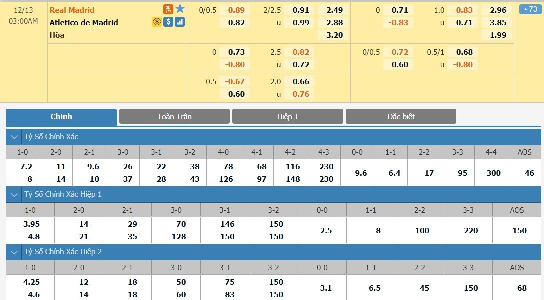 Tỷ lệ kèo cá cược bóng đá trận Real Madrid vs Atletico Madrid