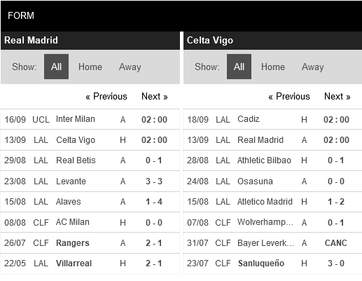 Thống kê phong độ Real Madrid vs Celta Vigo