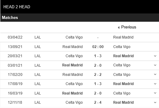 Thống kê đối đầu Real Madrid vs Celta Vigo