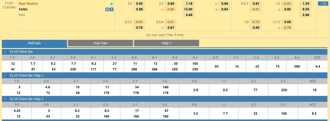 Tỷ lệ kèo cá cược bóng đá trận Real Madrid vs Celtic