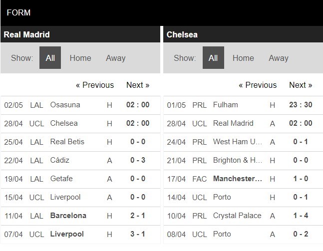 Thống kê phong độ Real Madrid vs Chelsea