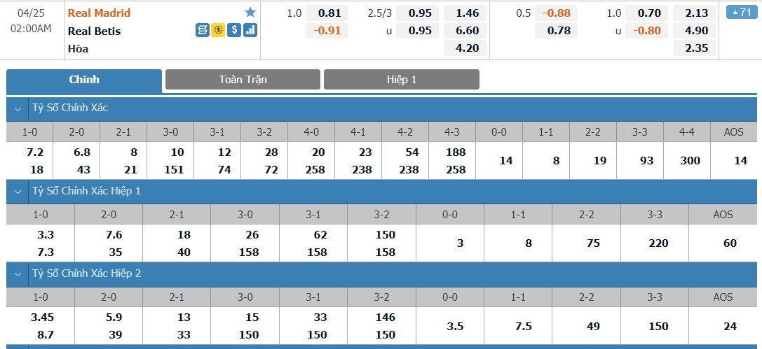 Tỷ lệ kèo cá cược bóng đá trực tuyến trận Real Madrid vs Real Betis