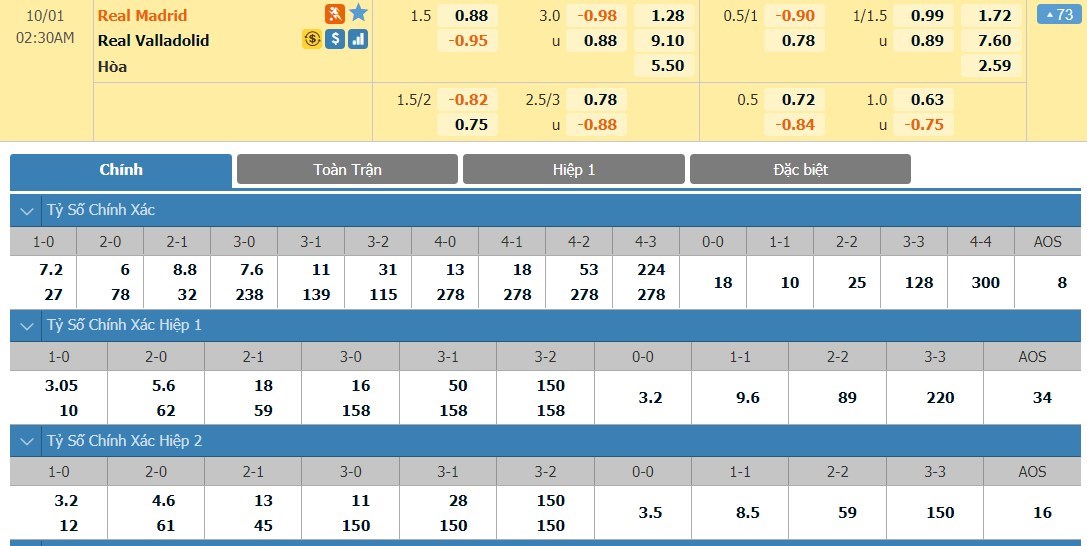 Tỷ lệ kèo cá cược bóng đá trận Real Madrid vs Valladolid