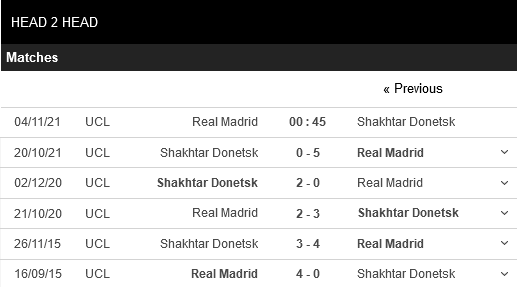 Thống kê đối đầu Real Madrid vs Shakhtar Donetsk