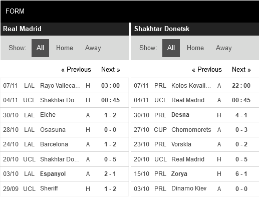 Thống kê phong độ Real Madrid vs Shakhtar Donetsk