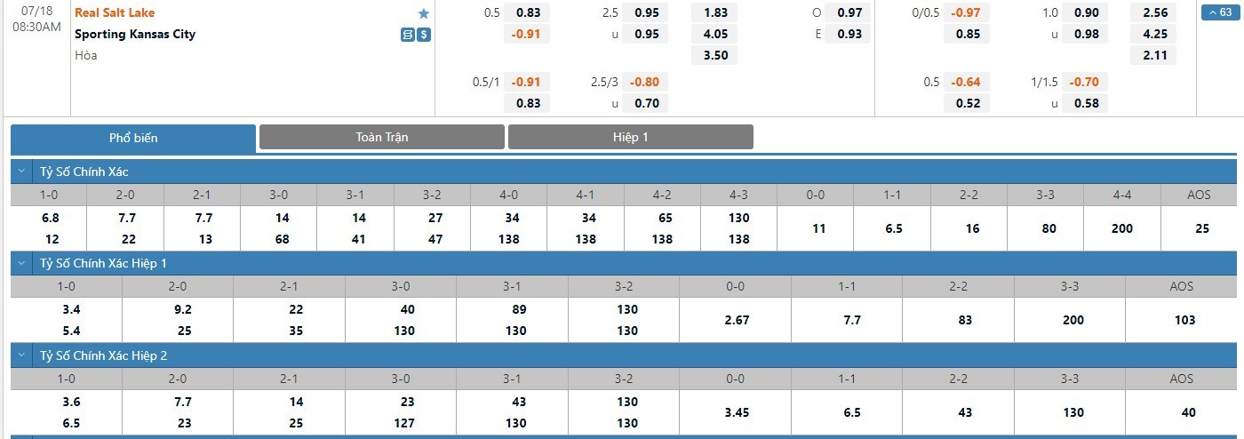Tỷ lệ kèo cá cược bóng đá trận Real Salt Lake vs Sporting Kansas City