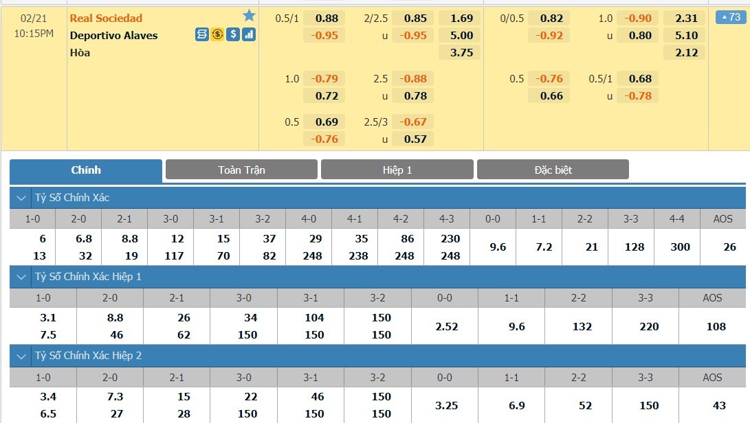 Tỷ lệ kèo cá cược bóng đá trận Real Sociedad vs Deportivo Alaves