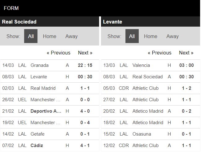 Thống kê phong độ Real Sociedad vs Levante