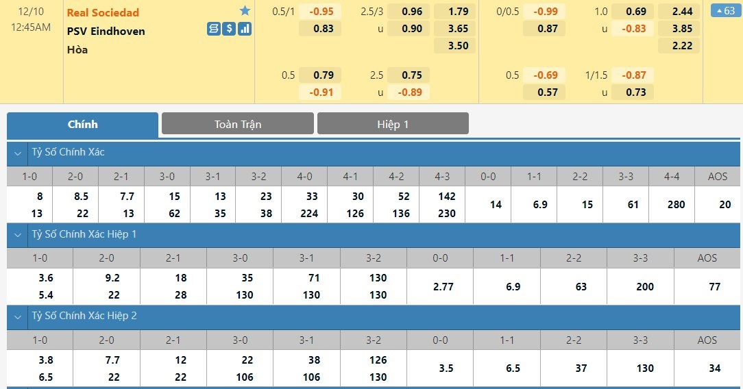 Tỷ lệ kèo cá cược bóng đá trận Real Sociedad vs PSV Eindhoven