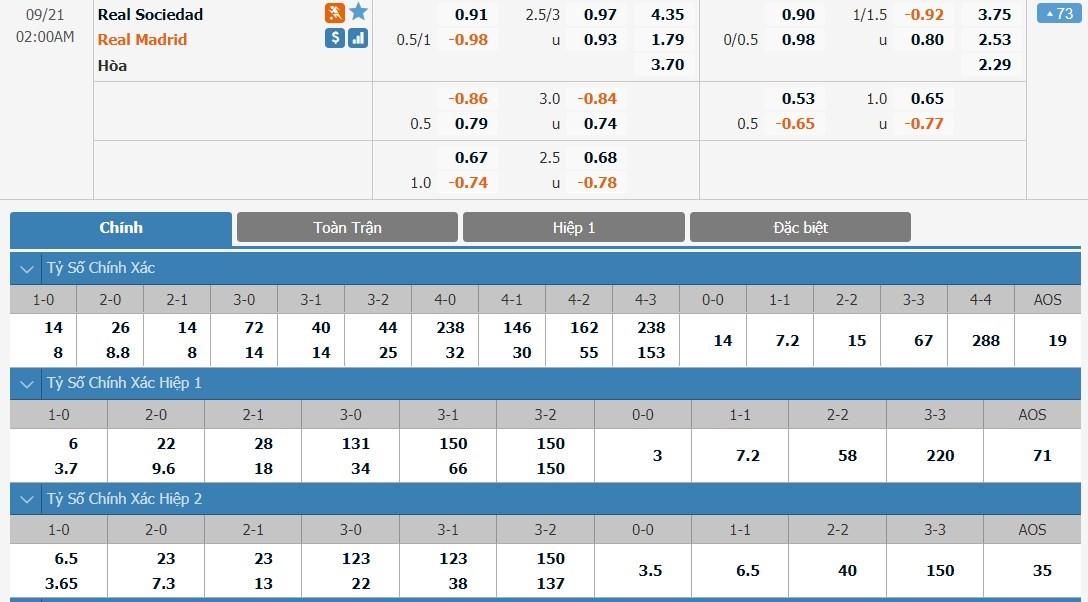 Xem tỷ lệ kèo cá cược bóng đá trực tuyến Real Sociedad vs Real Madrid