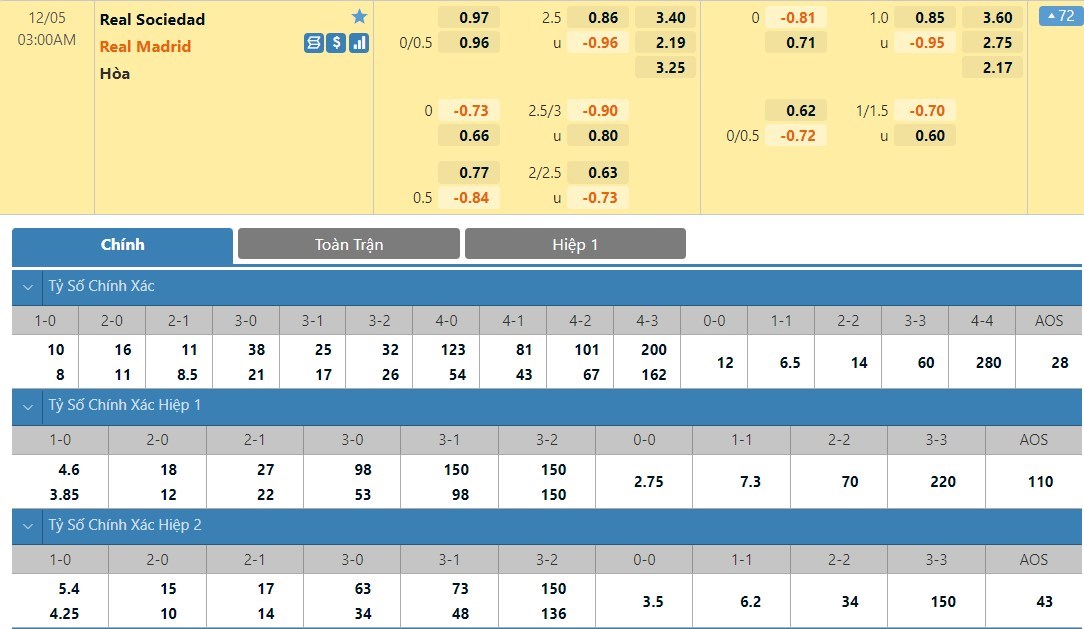 Tỷ lệ kèo cá cược bóng đá trực tuyến trận Real Sociedad vs Real Madrid