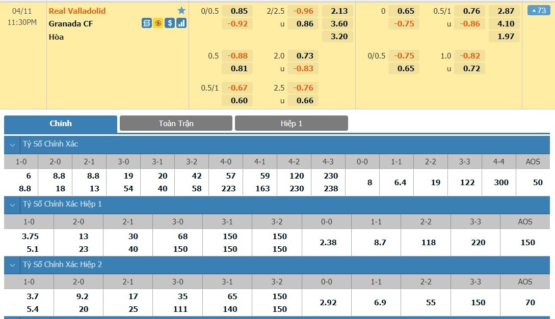 Tỷ lệ kèo cá cược bóng đá trận Real Valladolid vs Granada
