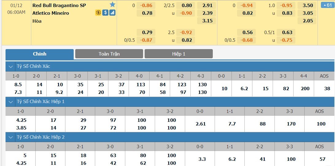Tỷ lệ kèo cá cược bóng đá trận Red Bull Bragantino vs Atletico MG