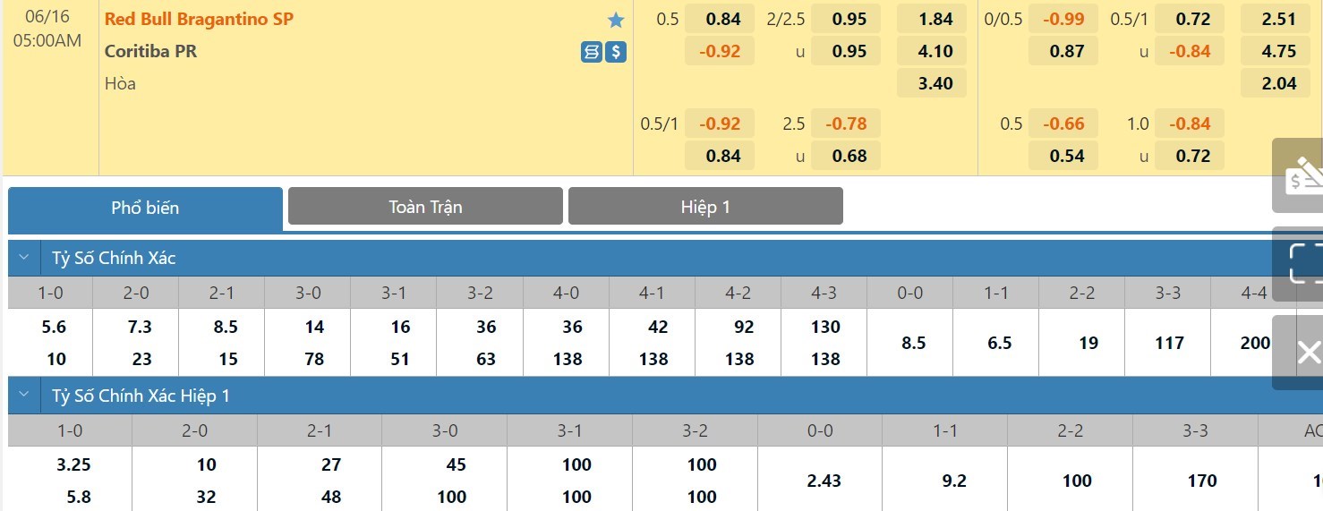 Xem tỷ lệ kèo cá cược bóng đá trực tuyến Red Bull Bragantino vs Coritiba