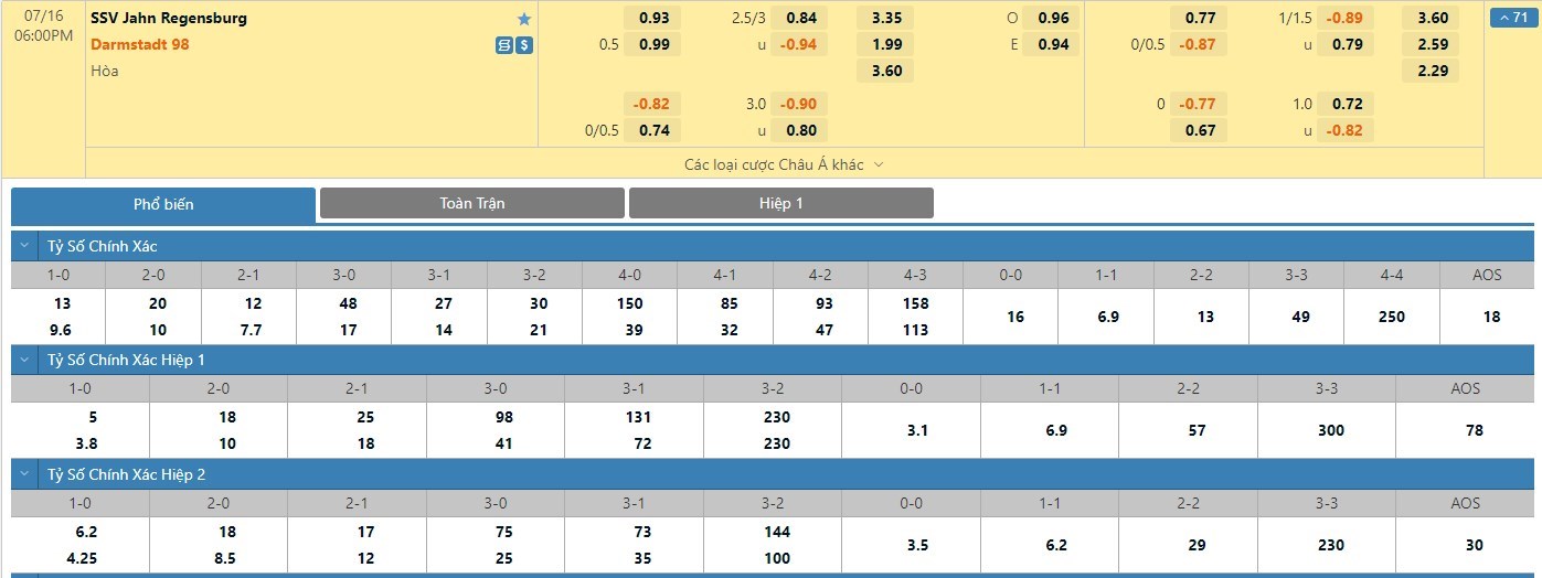 Tỷ lệ kèo cá cược bóng đá trực tuyến trận Regensburg vs Darmstadt