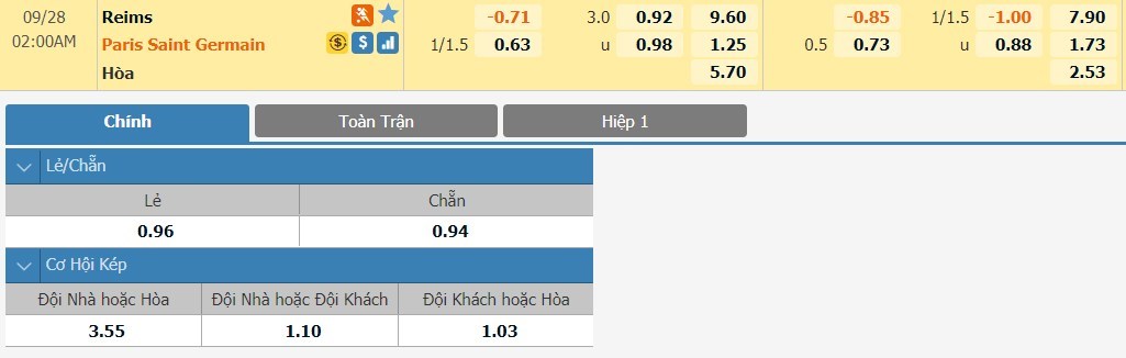 Tỷ lệ kèo cá cược bóng đá trực tuyến trận Reims vs Paris Saint-Germain