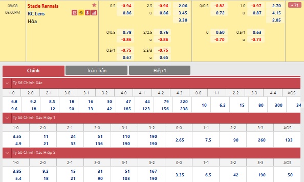Xem tỉ lệ kèo cá cược bóng đá trực tuyến Rennes vs Lens