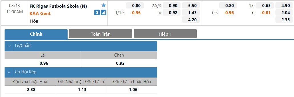 Tỷ lệ kèo cá cược bóng đá trực tuyến trận RFS vs Gent