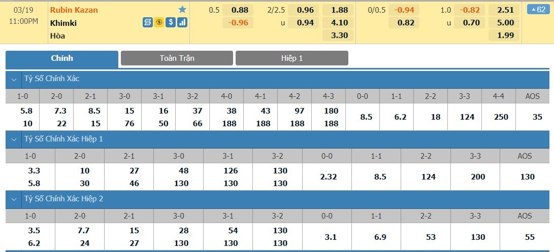 Tỷ lệ kèo cá cược bóng đá trận Rubin Kazan vs Khimki