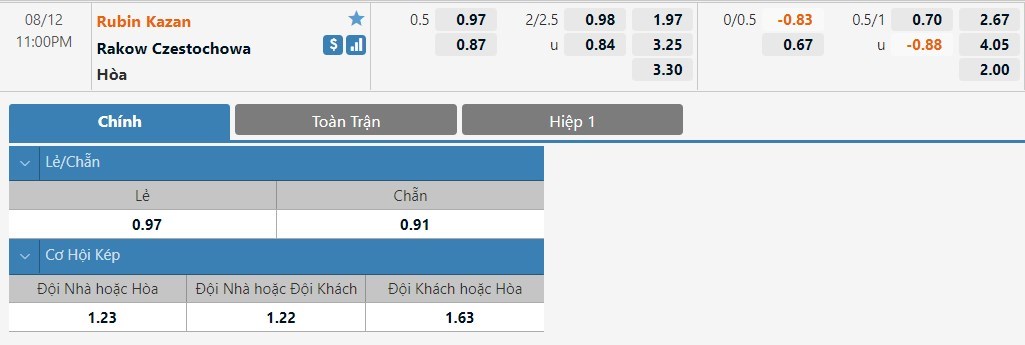 Tỷ lệ kèo cá cược bóng đá trận Rubin Kazan vs Rakow Czestochowa